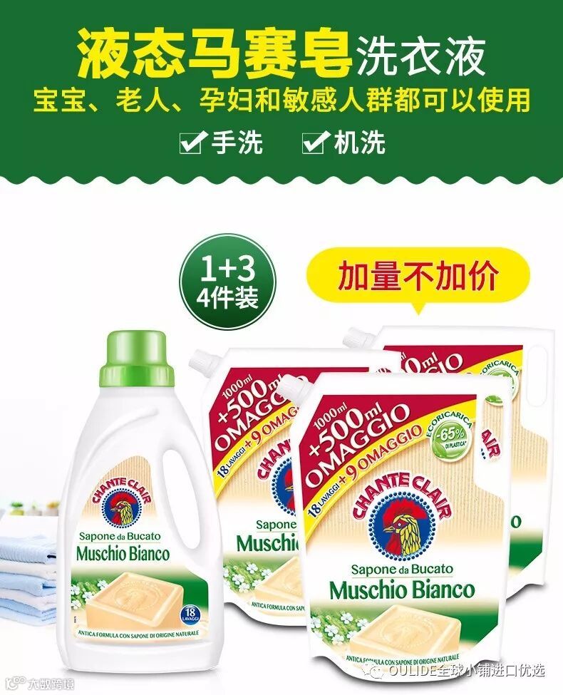 意大利香缇卡莱洗衣液分为两种香型,马赛香型、白麝香型,都是1L装,用个一年半载的,绝对没有问题的。棉麻织物、真丝、毛衣、牛仔等多种衣物原料,统统都能清洗。