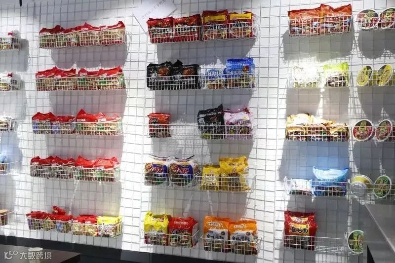 最大的一面墙留给了泡面。来自世界各地的网红泡面,漂洋过海齐聚于一墙,十分壮观,而各种颜色与图案的包装,在整个简约的素色店面中成为眼光聚焦的焦点。