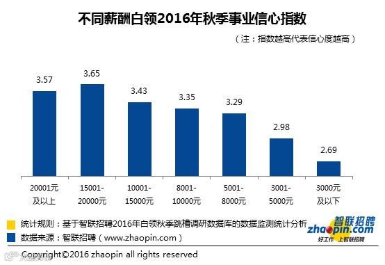 据《智联招聘2016秋季白领跳槽指数调研报告》,月收入15000-20000元白领的事业信心指数最高,为3.65,同时月薪20000元以上的白领事业信心也较高。而月收入在5000元以下的白领事业信心最弱,尤其是3000元以下的白领,其事业信心指数仅有2.69。