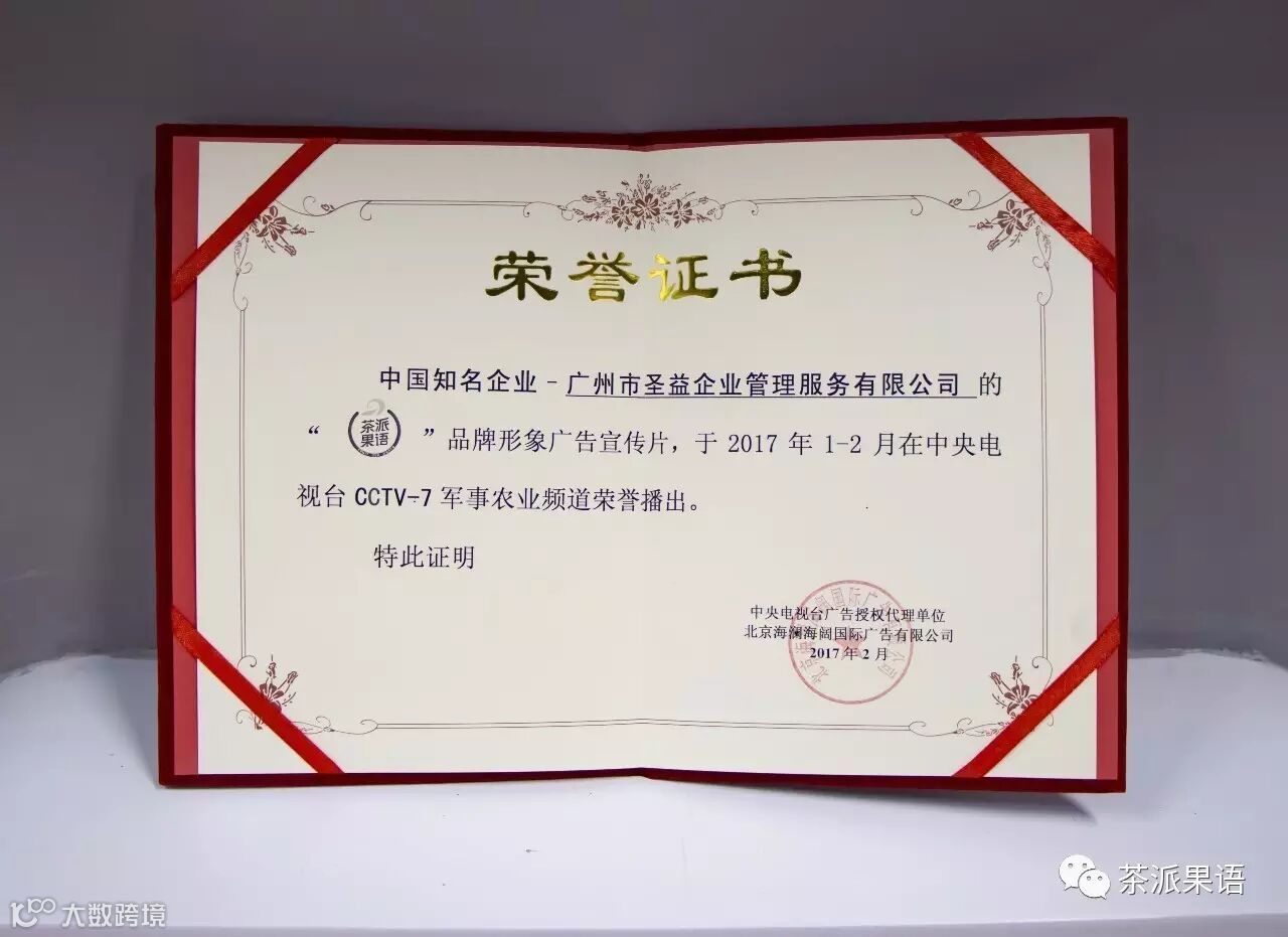 1月2日,茶派果语携“鲜果与青茶的邂逅,只为遇见更好的你”主题系列广告片,强势登陆央视,开启央视展播之旅。临近“满月”之际,茶派果语接到中央电视台颁发的荣誉证书,这是茶派果语权威、信誉品牌的又一有力诠释。
