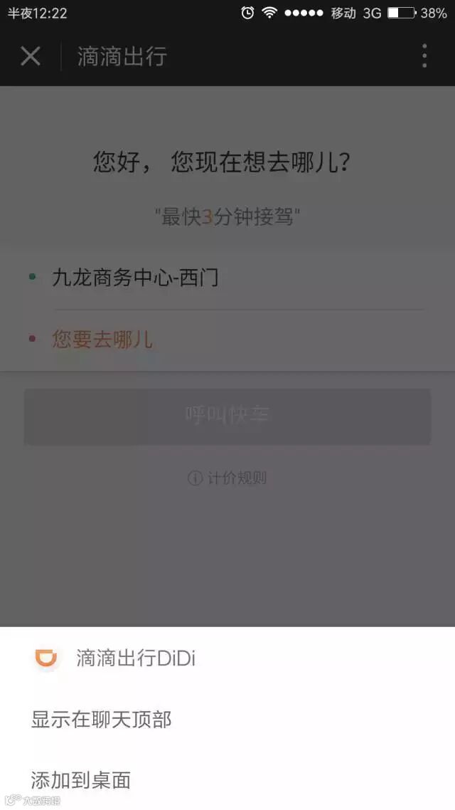 当搜索到小程序后还可以在微信聊天页面中置顶(只能置顶一个小程序),或添加到在桌面。▼
