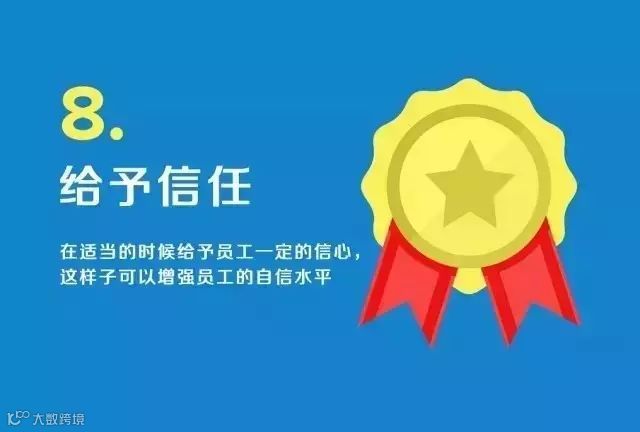 经常性地表示称赞,毫不吝惜地对员工的好表现表示赞赏,小小的称赞,对员工来说是一次极棒的加油。