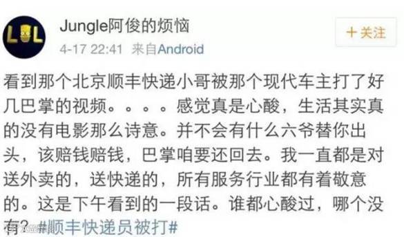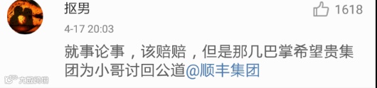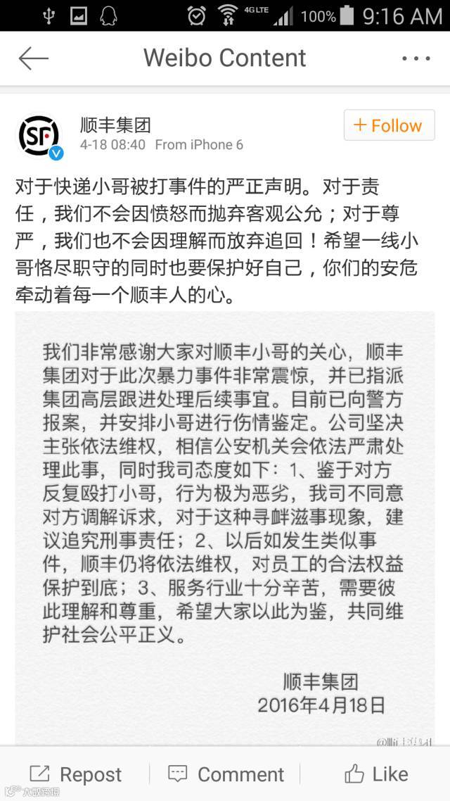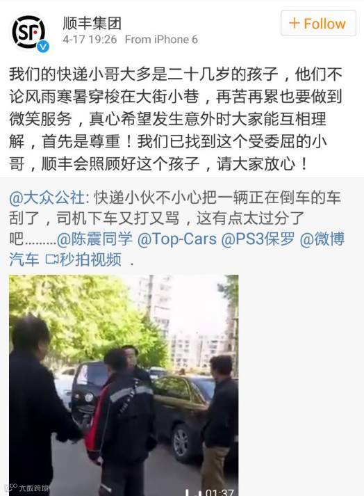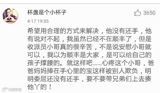 昨晚大约七点半,@顺丰集团做出回应称:已经找到了这位遭到殴打的小哥,会好好照顾他。