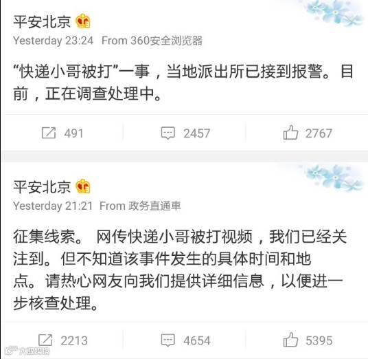 昨晚@平安北京连发两条微博表示已关注此事,请热心网友提供详细线索,目前,正在调查处理中。