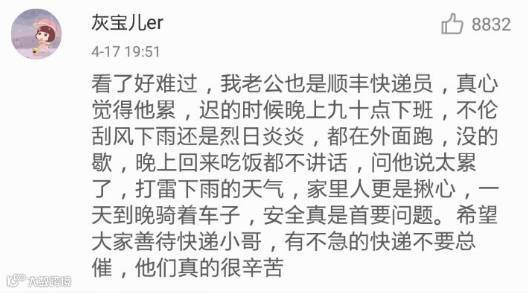 此前,@顺丰集团还留言:“我们的快递小哥大多是二十几岁的孩子,他们不论风雨寒暑穿梭在大街小巷,再苦再累也要做到微笑服务,真心希望发生意外时大家能互相理解,首先是尊重!我们已找到这个受委屈的小哥,顺丰会照顾好这个孩子,请大家放心!”