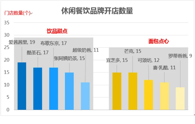 面包点心类占比高于饮品甜点(面包点心占比60%,饮品甜点占比40%),但两者的门店数量相差不大。面包点心类品牌平均开店数量为13家,饮品甜点类品牌平均开店数量16家。