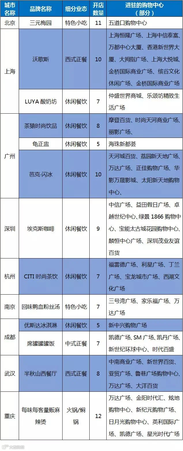备注:上表所列品牌为重点主要在1个城市开店,且开店规模在5家购物中心及以上的品牌;
