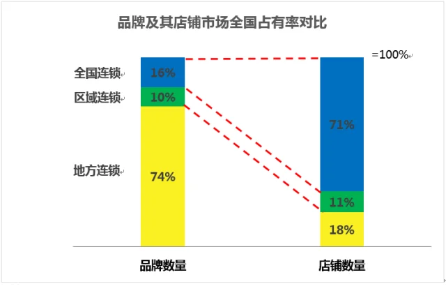 另一方面,覆盖全国市场或多个区域的全国性连锁品牌占16%,而这16%的全国连锁品牌开设的店铺数量占总店铺数量80321中的71%,呈现出中国品牌市场中的“二八规律”。