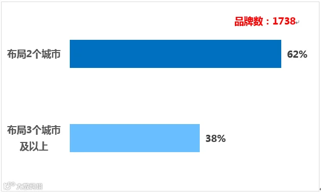 2)所取样本中,区域连锁品牌为1738个,其中,只布局了两个城市的品牌占比62%,布局三个城市及以上的品牌占比38%。