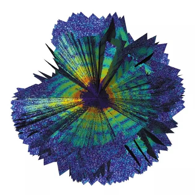 这是一张“拟菌病毒”(mimivirus)的3维重建图像。拟菌病毒是一种个头硕大的病毒,它是在一种阿米巴变形虫当中发现的。为了得到这种病毒的3维结构,研究者们事先对它拍摄了上百张2维图像。研究者发现,尽管这种巨型病毒无法形成结晶,但通过强大的X射线自由电子激光技术,我们依然可以重建单个病毒颗粒的3维结构。