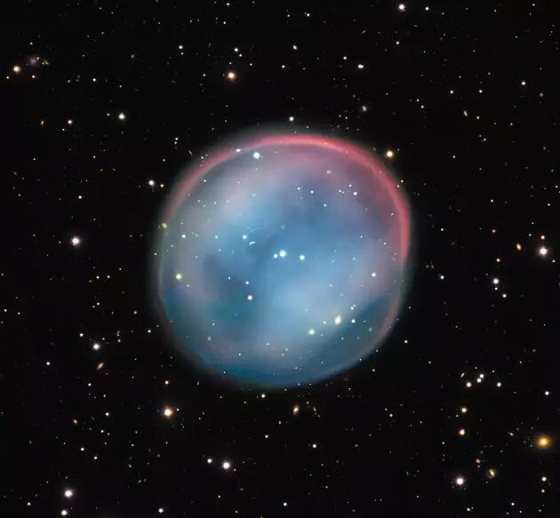 照片中这一鬼魅的图景是一个行星状星云——也就是一颗即将死亡的恒星遗留下来的残骸,它正散发着柔和的光辉。它的昵称叫“南猫头鹰星云”(Southern Owl Nebula),照片由位于智利的甚大望远镜拍摄。