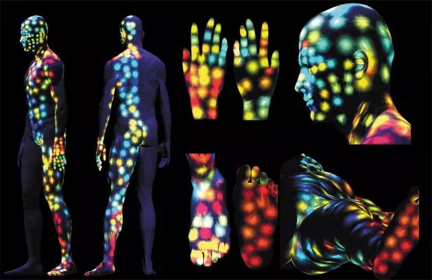 这张光影斑驳的彩点图是对人体最大的器官——皮肤上的化学物质及微生物进行的记录。两位甘愿为科学献身的健康志愿者3天没有洗澡,随后由研究人员用棉签在他们身体半边的400个位点分别拭取了样品进行分析,并根据细菌和分子的多样性制作了这张图片。