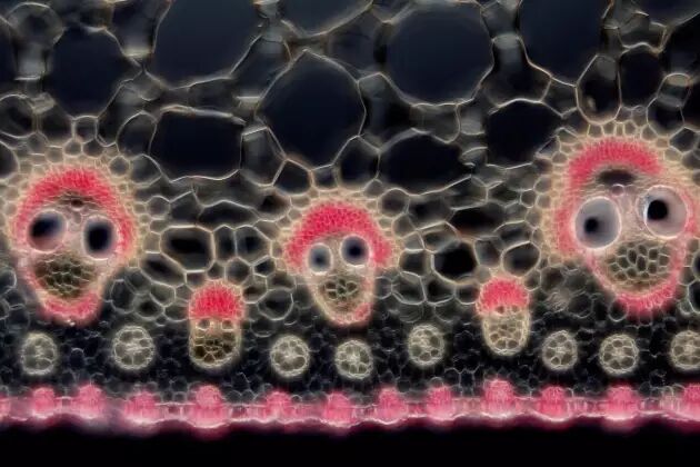 这些小骷髅般的怪异物体其实是纸莎草(Cyperus papyrus)的关键部位——维管束放大200倍之后的模样,这些结构负责在植物体内的组织间运输液体。该照片由大卫•麦特兰(David Maitland)拍摄。