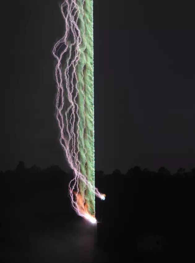 对一些人来说,落雷和闪电非常可怕。不过,在佛罗里达的国际闪电研究测试中心(International Center for Lightning Research and Testing),人们会通过发射特制的火箭来触发“人造闪电”用于研究。这些火箭会拖着接地导线进入雷暴云中引发闪电,这张长时间曝光图片就展现了研究人员在一次“闪电触发”之后发生的事情。