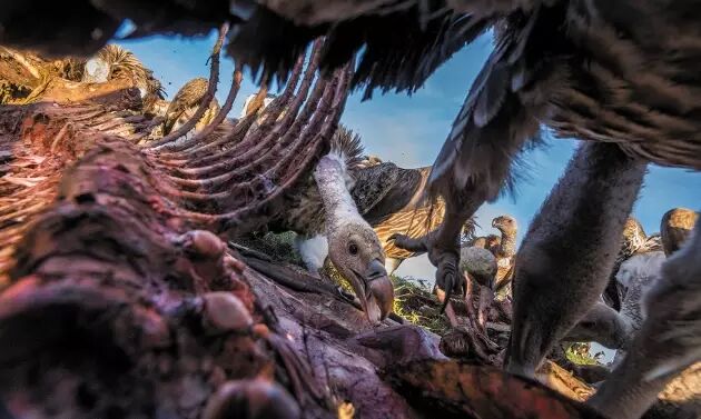 一个被安置在动物尸体中的摄像头清晰地记录下了非洲秃鹫们的日常生活。尽管现场有点恐怖,但这种鸟类的食性却是维持生态系统平衡的关键一环。