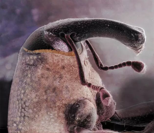 这张棉铃象甲(Anthonomus grandis)的超清“大头照”是本年度“惠康影像大奖”(Wellcome Image Awards)的获奖作品之一。照片由扫描电子显微镜拍摄而成,而作为模特的象鼻虫头部大小其实只有几毫米。