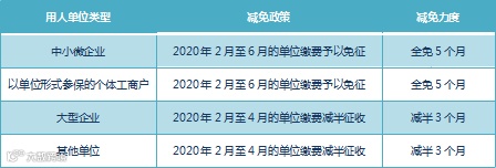 用人单位按照不同的规模类型享受不同的减免政策。其中,中小微企业以及以单位形式参保的个体工商户能享受最大力度的减免优惠政策。具体如下: