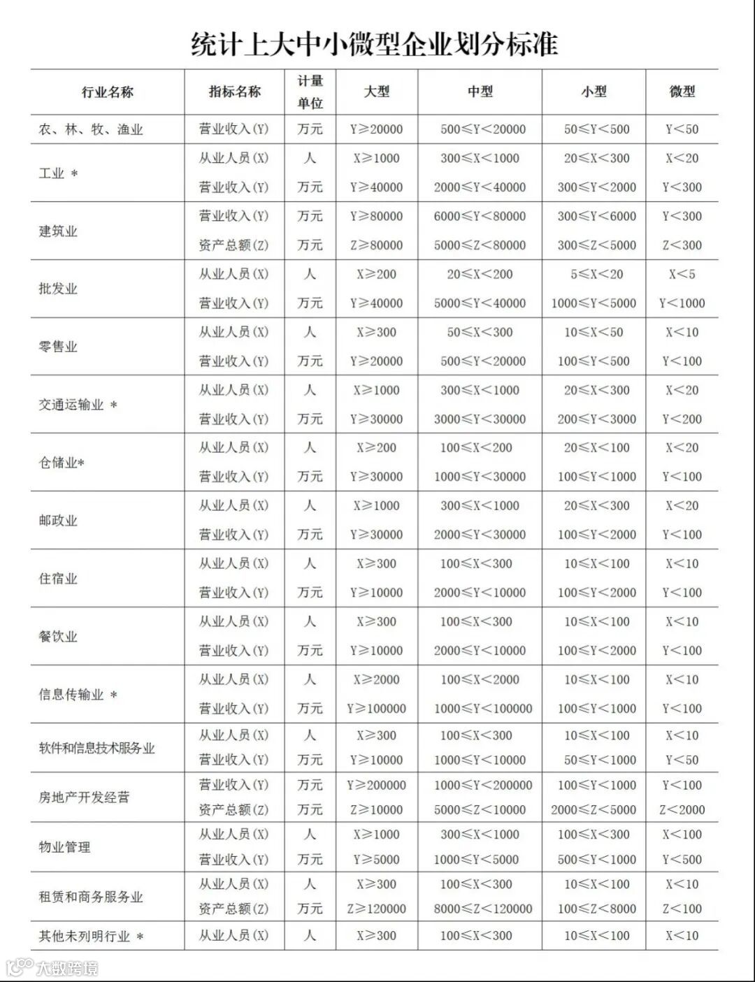企业类型划分的依据是《关于印发中小企业划型标准规定的通知》(工信部联企业〔2011〕300号)、《国家统计局关于印发统计上大中小微企业划分办法(2017)的通知》(国统字〔2017〕213号)。具体的划分标准详见下表: