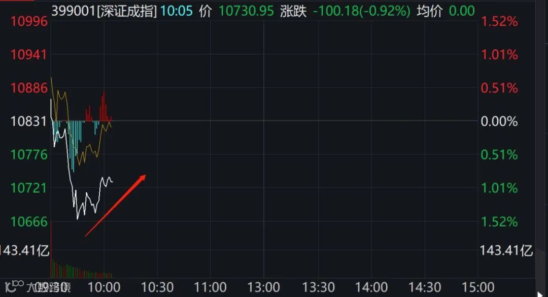 在9点46分左右,在央行发布实施定向降准及MLF操作后,三大指数再度从底部开始短暂回升。