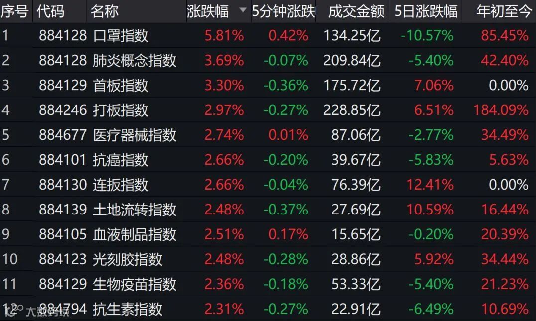 而从当天盘面上看,口罩指数、流感指数、肺炎概念等疫情相关题材板块表现活跃。