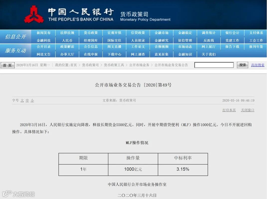 当日,中国央行公告称:2020年3月16日,人民银行实施定向降准,释放长期资金5500亿元。同时,开展中期借贷便利(MLF)操作1000亿元。今日不开展逆回购操作。中标利率3.15%,和上次持平。