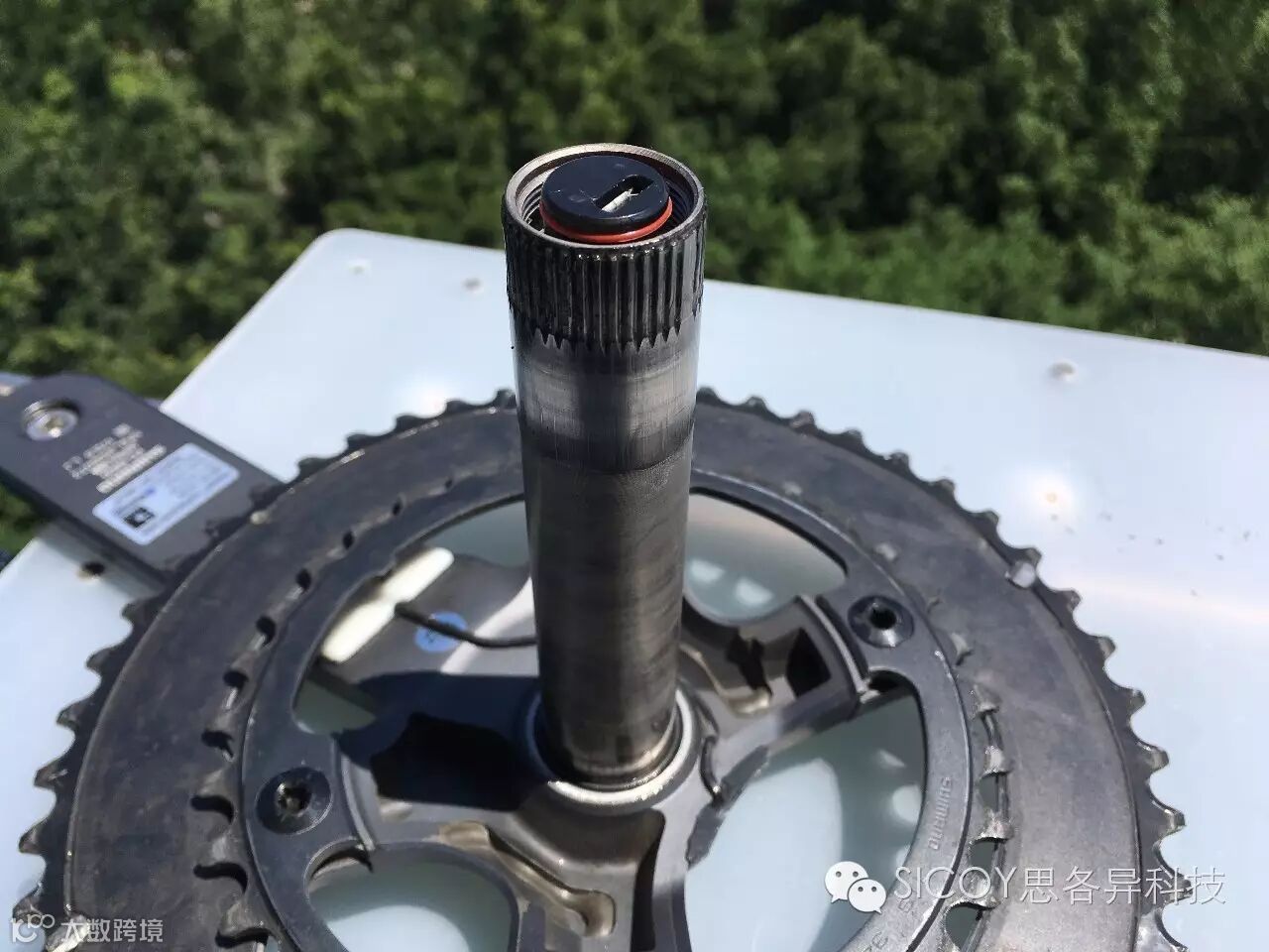 而右曲柄的测量则是一种较为成熟的技术,我们暂不进行叙述。大家可以看到的是,测量右曲柄的应变计被安装于右曲柄内侧,类似于先锋的安装方式。然后,一条电缆绕过牙盘背后,连接至中轴。没错,这里需要在牙盘的右侧钻一个2.5mm的过线孔(图5)。经过多次的测试,我们认为这个孔不会对牙盘刚性造成影响,大家请放心。