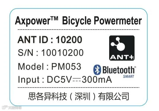 铭牌位于右曲柄内侧下端。包括ANT ID、序列号S/N、型号Model、充电电压电流Input。