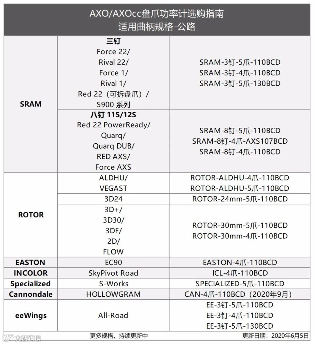 截至2020年6月,包括SRAM、ROTOR、EASTON、SPECIALIZED、Neutron等主流品牌的曲柄均有对应的AXO盘爪可选。SRAM三钉、SRAM八钉、Aldhu等主流花键界面甚至有多个BCD选项,让用户可以有更大的盘片选择自由度!
