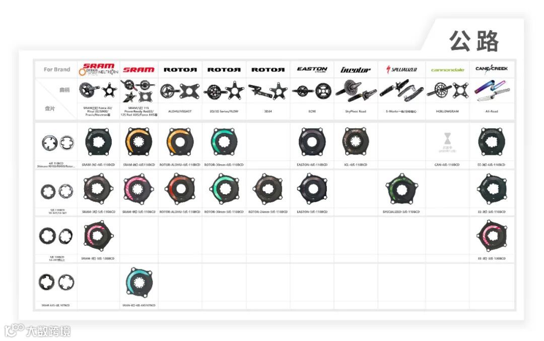 AXO提供了26个规格,支持SRAM、Rotor、Easton、SPECIALIZED等品牌的曲柄产品;覆盖4爪107BCD、4爪110BCD、5爪110BCD以及5爪130BCD,有着极佳的兼容性。