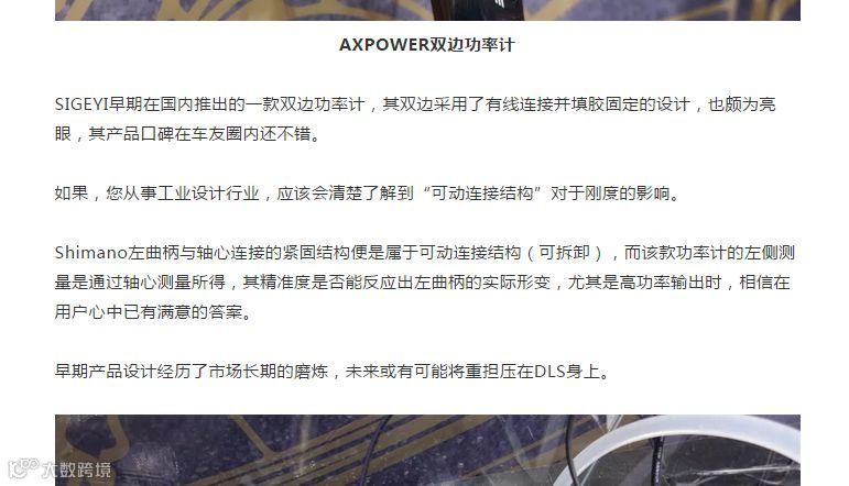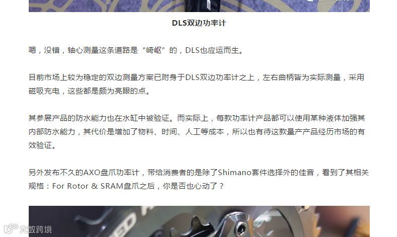 作者下文中对DLS和AXO功率计的介绍也有类似错误或者臆测问题,比如说轴心之路“崎岖”才有了DLS,使用某种液体加强防水所以增加了成本,AXO盘爪是发布不久的产品,AXPOWER续航参数错误等,我们就不一一列举回复了。