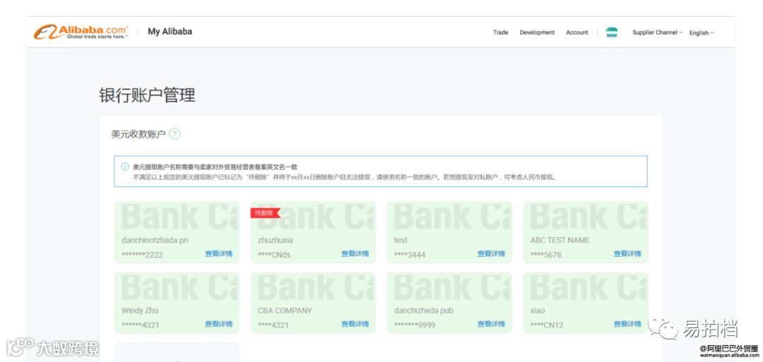 2018年10月16日起,中国大陆所有付费供应商的美元对公收款账户将启动对公英文名称校验,用基准英文账户名验证该用户其他美元对公收款账户,英文账户名与此不一致的,在美元账户列表页面打标记待删除。