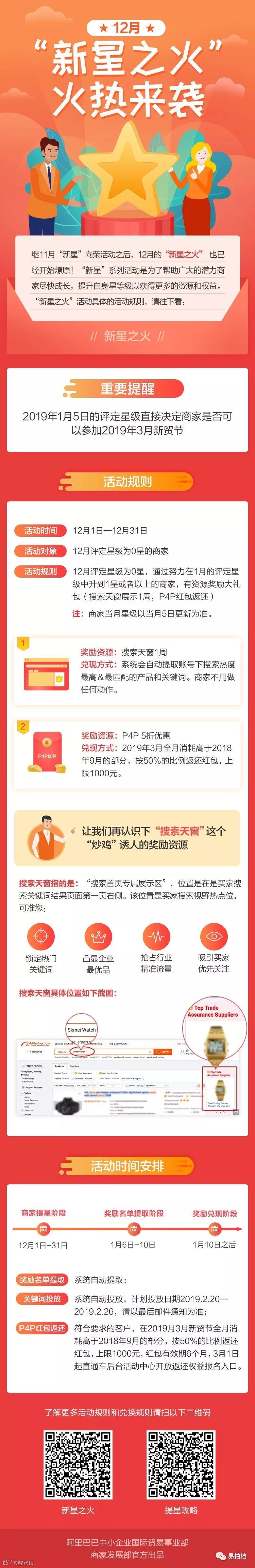2、12月期间商家星等级0星客户升级到1星或者1星以上,有机会获得:搜索天窗一周、P4P消耗5折。更多详情,请点开长图,获得更多新贸节攻略。