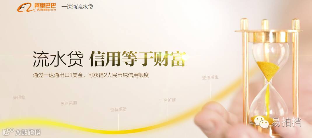 一达通流水贷是面向使用阿里巴巴一达通出口基础服务的客户,以出口额度积累授信额度的无抵押、免担保、纯信用贷款服务,该服务由阿里巴巴联合多家银行共同推出,