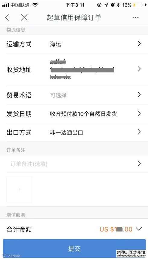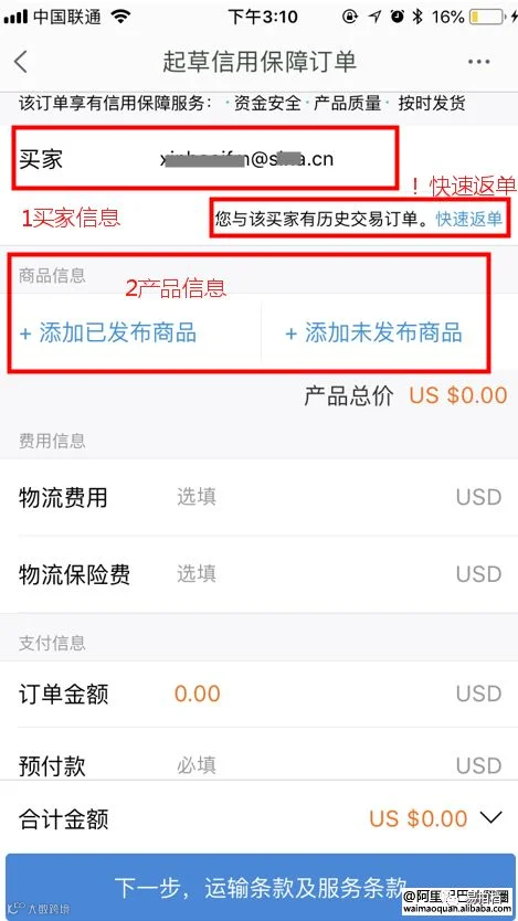 第二步:分别填好买家信息、产品信息、及运输和物流相关信息,