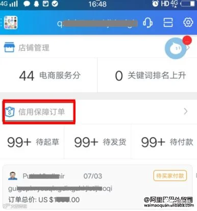 第一步:登录手机阿里卖家,点击信用保障订单。