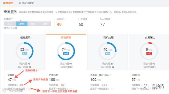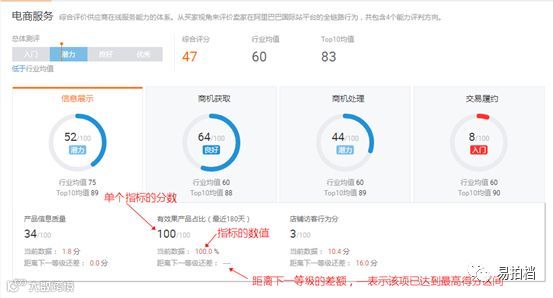 “电商服务”是供应商服务指数的一部分,是对供应商在线服务能力的综合评分体系。它从买家视角来评价卖家在阿里巴巴国际站平台的全链路行为,共包含4大能力项,总分100分。
