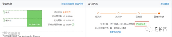 按时发货率是统计了180天的已付款的信用保障订单。每笔已发货的订单是可以在订单详情页面看的,如果按时发货的,可以查看到如下标志: