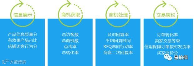 2)从买家视角出发新增店铺访客行为分、有效果产品占比、询盘二次回复率、RFQ意向行动率和买家评价分;其中买家评价分还未上线,暂不计算分数;