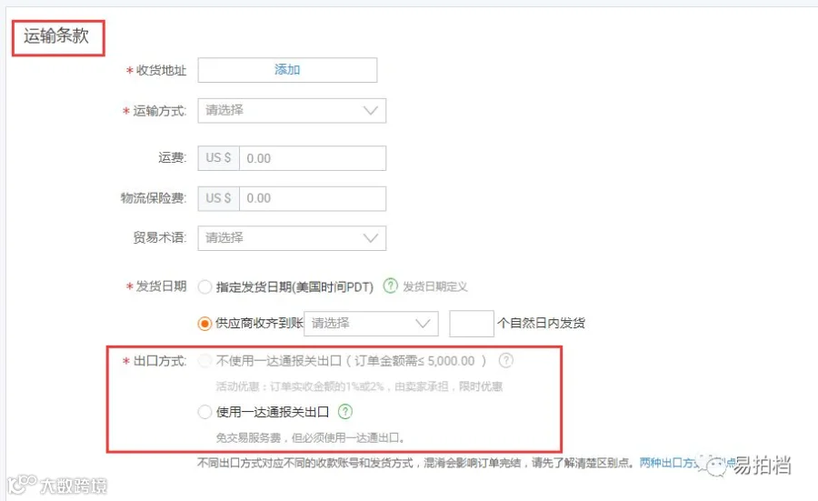 关于发货日期:使用一达通出口,系统将以一达通出口订单的通关办理完毕日期作为实际发货日期;不使用一达通代理出口,系统将以阿里国际快递的取件时间或者第三方物流凭证的上传时间作为实际发货日期。
