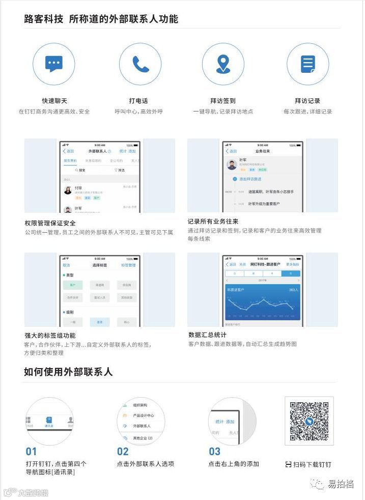 钉钉外部联系人功能,可以录入拜访,不同主管设置角色,不同查看权限,老板可以查看拜访数据,签到,关键是员工离职带不走任何信息,属于公司客户群可以剔除离职员工,高效管理客户,录拜访,防止客户信息被带走。