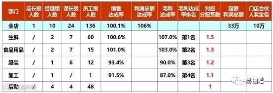 例如:卖场店A店第一季度,全店销售达成100.1%,利润总额达成106%,利润超额33万, 门店合伙人奖金包10万。以下为各部门人数、达成情况: