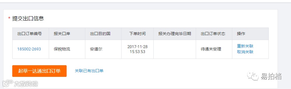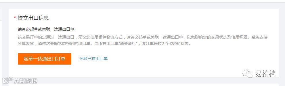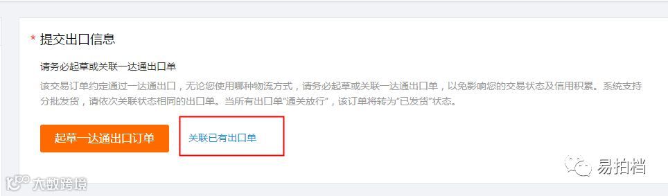 起草出口订单成功后,刷新发货台页面或订单详情页面,系统自动将该笔一达通出口订单关联到此笔信用保障订单中,一达通出口订单通关完毕后,信用保障订单状态也会更新为待买家确认收货。