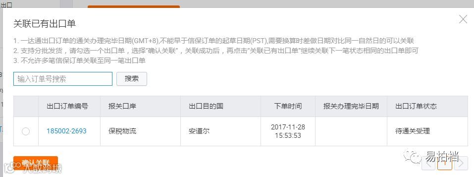 情况二、若已有一达通出口订单,可点击“关联订单”按钮,选择相应的一达通出口订单后,点击“确认关联”即可绑定到当前信保服务订单,订单状态更换为“发货中”,待一达通出口订单通关完成以后,订单状态更新为“待买家确认收货”: