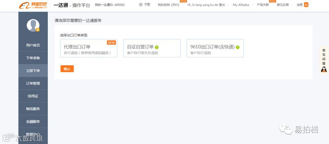 提醒:若您不知道选择哪种订单类型,或在起草一达通出口订单过程中针对表单填写有任何问题,建议您直接咨询一拍档或一达通,联系电话: 4006552688