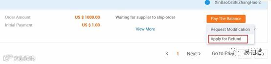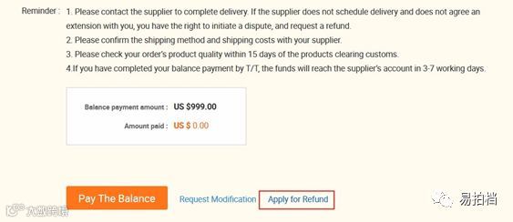 买家登陆My Alibaba后台-Order Managerment-All Orders),找到需要操作退款的订单,点击“Open a dispute":