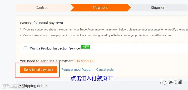 预付款到账后信用保障订单才会出现”pay the balance"尾款支付按钮;