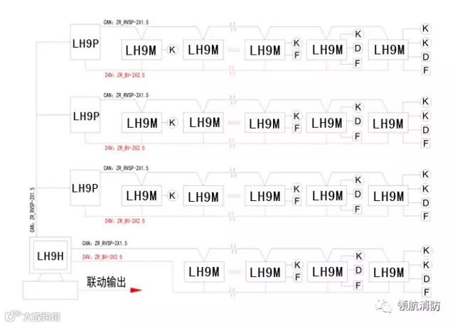 LH9H:防火门监控器, LH9P:防火门区域分机, K: 防火门门磁开关,D:防火门电动闭门器, F:防火门电磁释放器