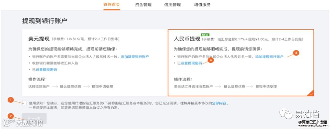 1)操作路径:卖家到“MA后台-信用保障服务管理中心-管理首页-其他出口可提-选择提现方式”中设置支付/提现密码(只有主账号可设置该密码);