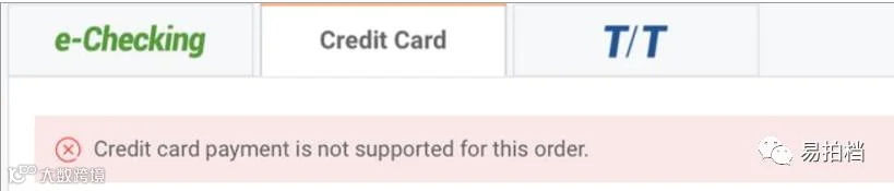 若买家支付时,买家无法选择信用卡支付(按钮为灰色不可选),或订单页面展示此订单不支持信用卡支付,则说明由于买家账号或信用卡原因导致未通过银行风控,为保障供应商资金安全,故无法使用信用卡支付: