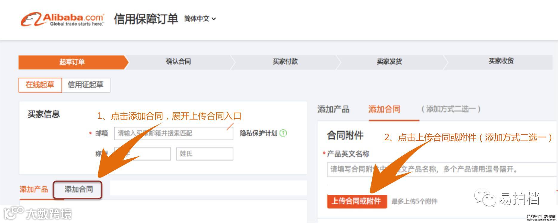 Ø“上传合同”起草方式融合到“在线起草”订单流程中,可在此流程中上传PI合同;